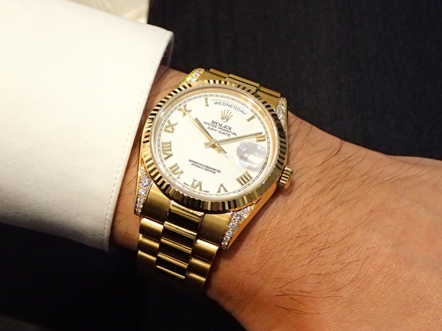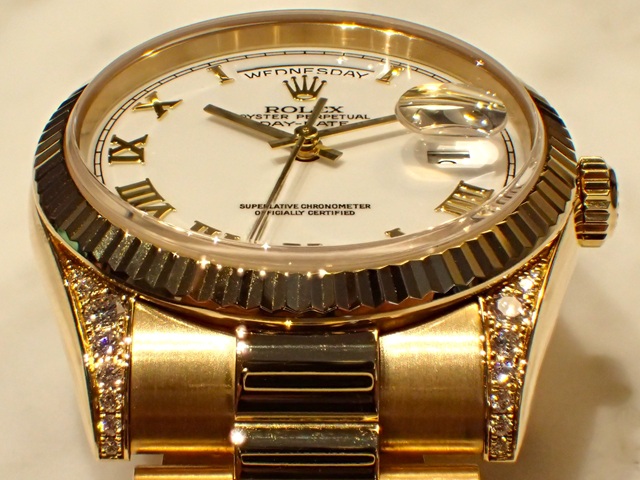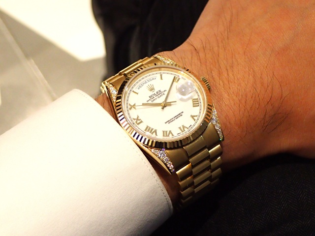 希少なラグダイヤ仕様ですが、シンプルなホワイトローマインデックスとデイデイト専用プレジデントブレスにより、意外とサラッとお使いいただけるスペシャルモデルとなっています。