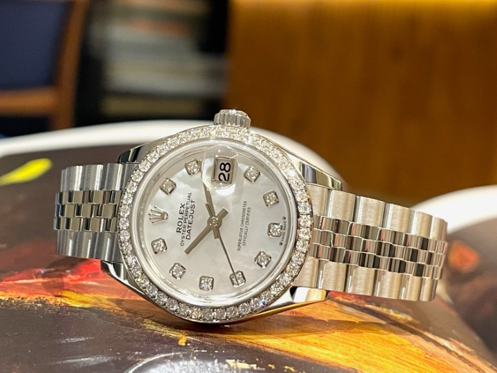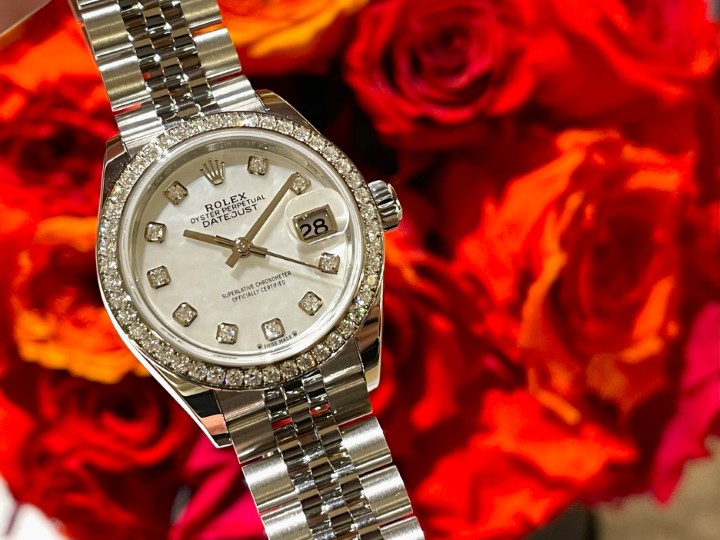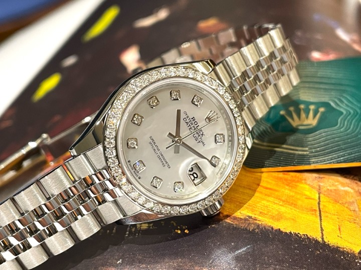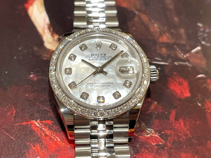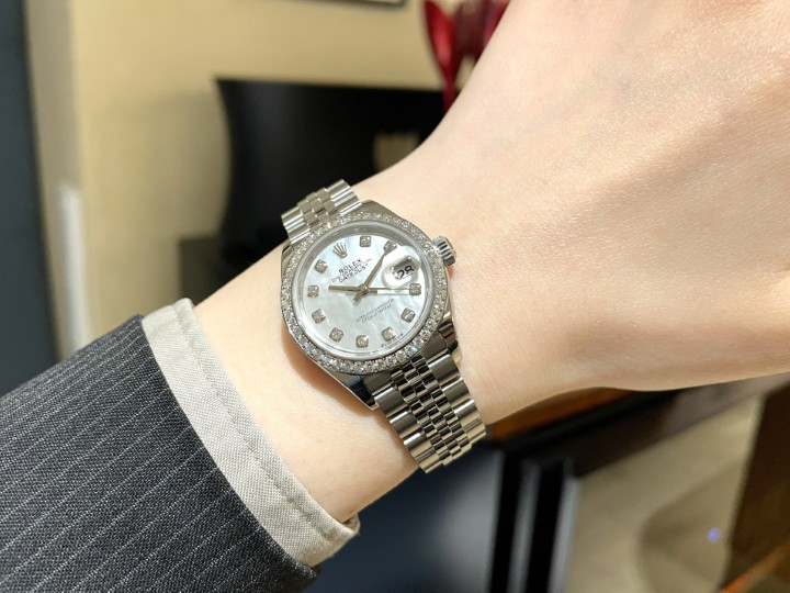 インパクト抜群のベゼルダイヤに加え、ホワイトシェルダイヤルに10Pダイヤがより高級感を高め、