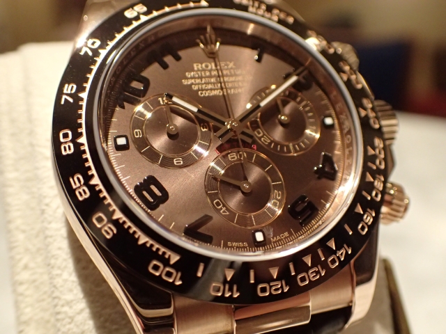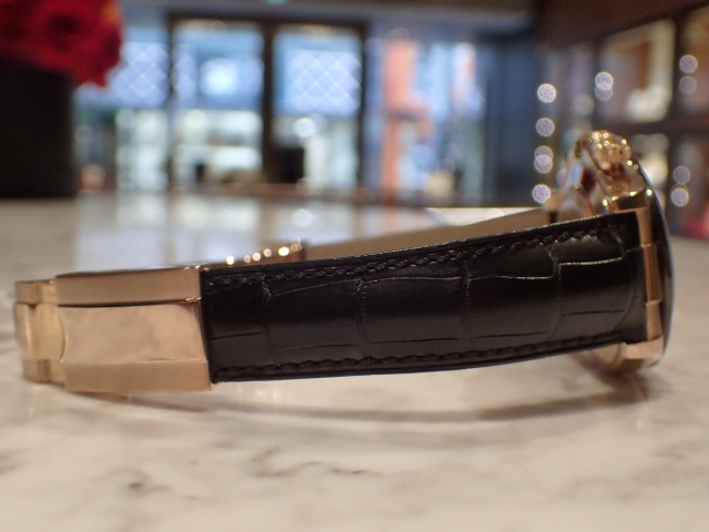 素材のピンクゴールドとの相性が絶妙なチョコレートダイヤル。金無垢モデルの存在感は