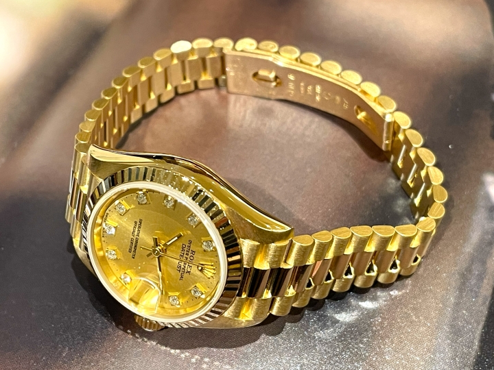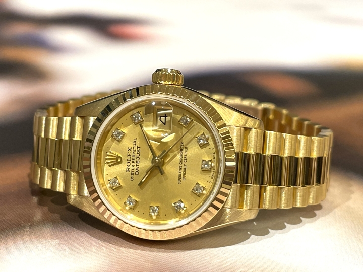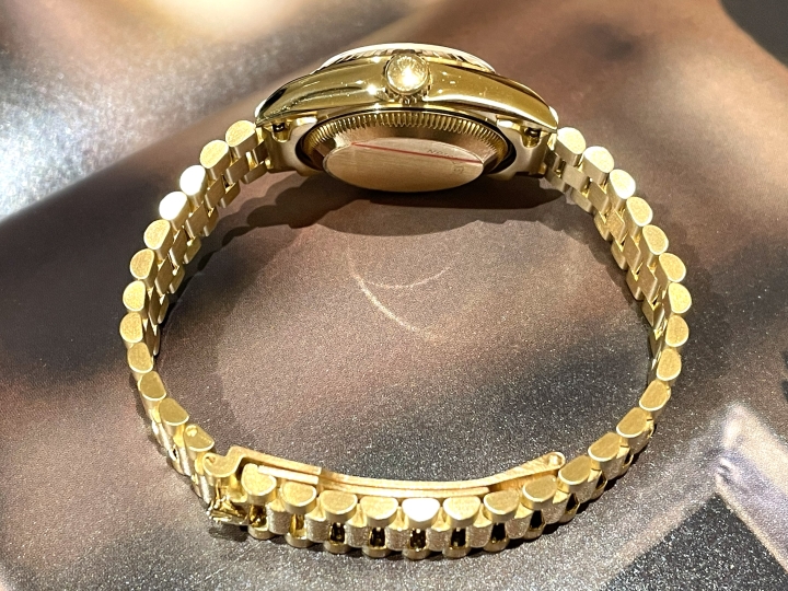 ケースやブレスレット18Kイエローゴールドのみで構成されたケース径26mmの旧型モデル。