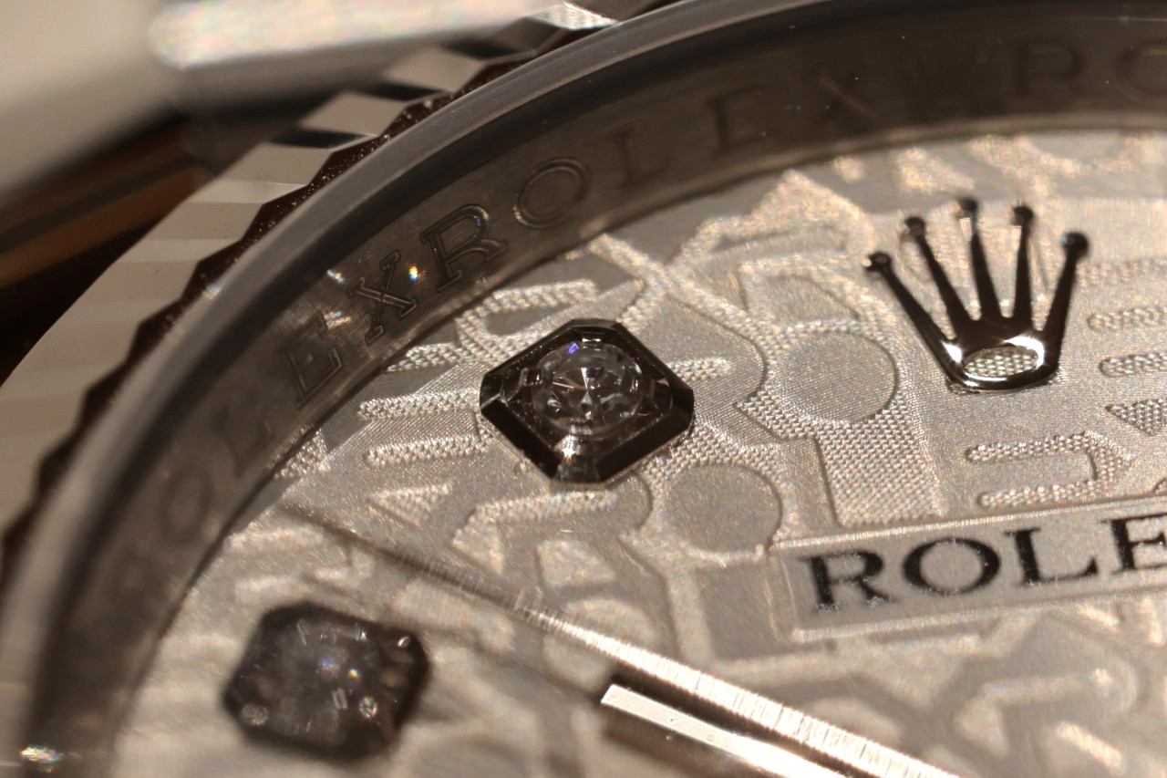 よく見ると”ROLEX”と所せましに彫られているのが分かります。インデックスはダイヤがセット
