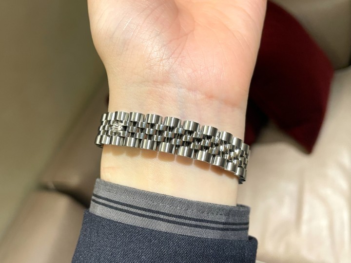 バックル部分は、ハイクラスモデルのデイデイトに採用されているコンシールドクラスプで、スマートさを演出しており、高級感があります。ジュビリーブレスレットによくあるブレスレットの伸びは、